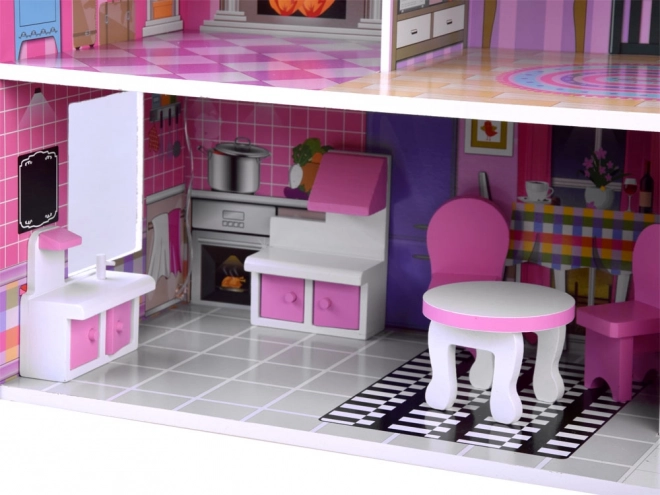 Elegantna drvena kućica za lutke s 3 kata i 5 prostorija, bogatim setom namještaja i nježnim LED osvjetljenjem. Čvrsta konstrukcija, dimenzije 70 × 60 × 24 cm i jednostavna montaža do 30 minuta potiču kreativnu igru s lutkama tipa BARBIE i ANLILY.