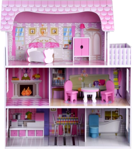 Ružičasto‑ljubičasta drvena kućica za lutke oduševljava detaljnim ilustracijama i otvorenom arhitekturom za jednostavan pristup svakoj prostoriji. Tri kata nude pet potpuno opremljenih zona i terasu, koje pozivaju na duge sate maštovite igre. Zahvaljujući stabilnoj drvenoj konstrukciji i promišljenim proporcijama, idealno je središte dječje sobe.