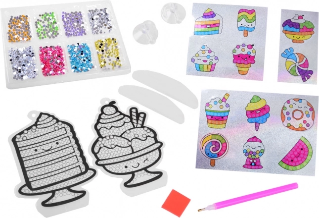 Izradite svjetlucave naljepnice i viseće ukrase (npr. za prozor) uz pomoć 2 velike šablone, vakuumskih čašica s kukicama i 12 zabavnih motiva deserata.