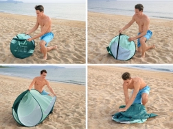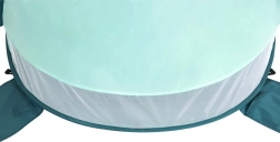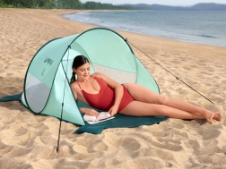 Promišljena ventilacija s dvama bočnim prozorima i stražnjim mrežastim panelom održava ugodnu klimu u unutrašnjosti. 8 klinova i 4 džepa za pijesak povećavaju stabilnost i pri vjetru, dok je konstrukcija od stakloplastike lagana i elastična. Šator udobno prima 2 odrasle osobe, a nakon sklapanja zauzima minimalno mjesta u priloženoj torbi.