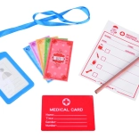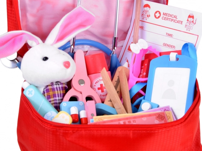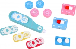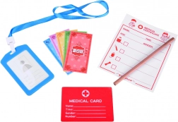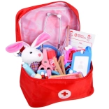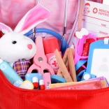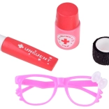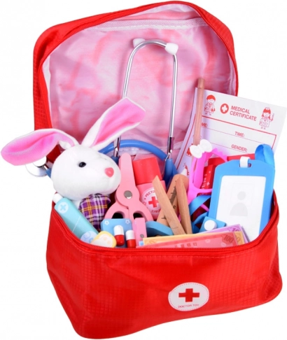 Dio seta je i toplomjer s izmjenjivim diskovima, šprica, škare, pinceta, zavoj, flasteri, “lijekovi” u tabletama i kapsulama (rekviziti), sirup i mast u tubi, kartice pacijenta i liječnički iskaz. Sve se lako sprema u izdržljivu crvenu torbicu s ručkom, pa je set idealan i za putovanja i brze intervencije.