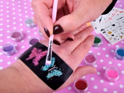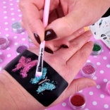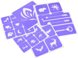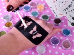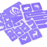 Jednostavna primjena korak po korak: odaberite šablonu, zalijepite na čistu kožu, premažite motiv ljepilom, uklonite šablonu, pustite da se kratko osuši i pospite šarene šljokice. Višak otresite – gotovo! Sve je spremljeno u praktičnoj, šarenoj kutiji za jednostavno odlaganje.