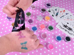 Veliki kreativni set za brokatne i vodene tetovaže pretvara svaku proslavu u doživljaj. Zahvaljujući širokom izboru šablona i raznobojnim šljokicama, djeca stvaraju originalne privremene tetovaže koje traju kroz nekoliko kupanja, a zatim nježno nestaju.