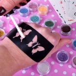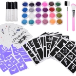 - 18 listova šablona za brokatne tetovaže, 12 listova vodenih tetovaža, 3 ljepila, 5 kistova, 24 posudice šljokica