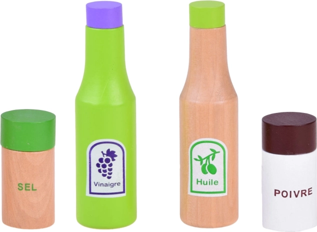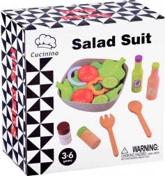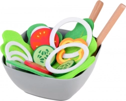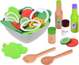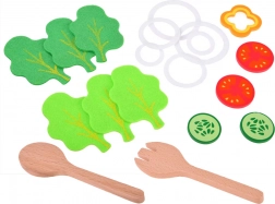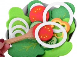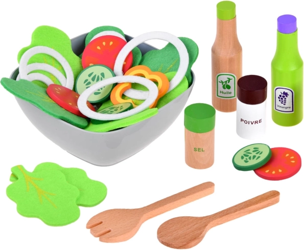 Tekstilne kriške povrća, drvene bočice za začine i žlice za posluživanje omogućuju djeci pripremu „prave” salate i potiču maštu u kuhinjskoj igri.