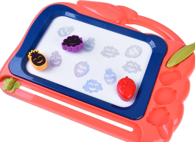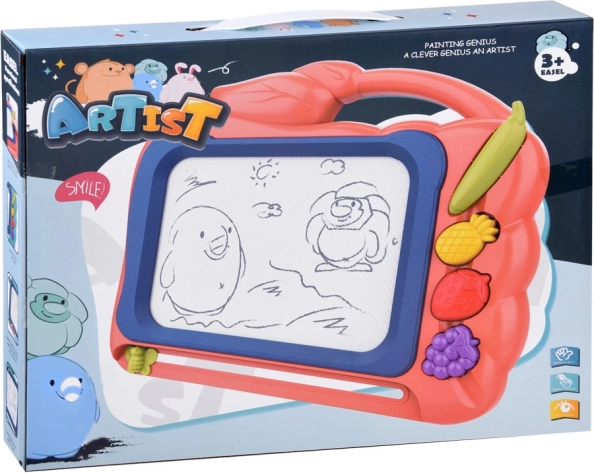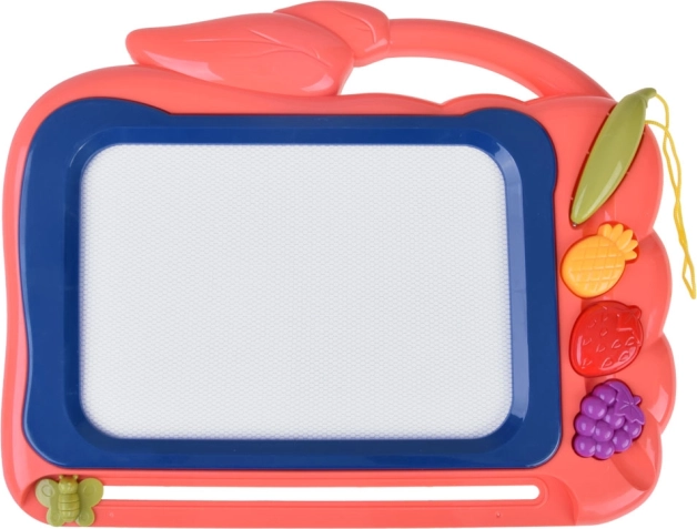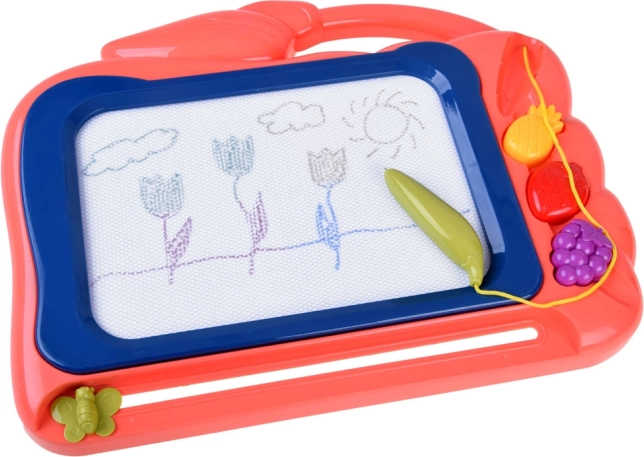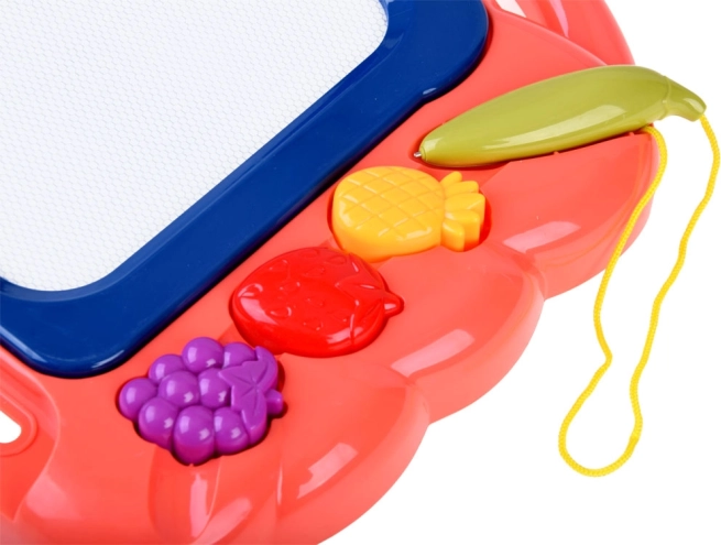 Ova kreativna ploča za crtanje nudi šarenu pozadinu na kojoj djeca lako stvaraju crteže pomoću priložene olovke. Tri žiga u obliku voća (ananas, jagoda i grožđe) svakom uratku dodaju razigrane detalje, razvijaju finu motoriku i potiču radost stvaranja.