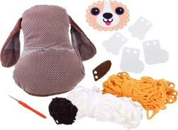 Otkrijte zabavni DIY set uz koji će djeca sama izraditi simpatičan jastučić u obliku psića. Za provlačenje nije potrebna igla ni šivanje – sve ćete napraviti lako i sigurno priloženom kukicom. Filcani dijelovi (šapice, njuškica, repić i papučice) jednostavno se pričvršćuju provlačenjem pređe kroz pripremljene otvore.