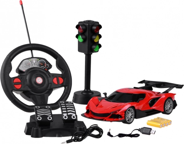 U pakiranju je sve za zabavu: RC auto, volan, papučice, semafor, punjivi akumulator i USB kabel za punjenje.
