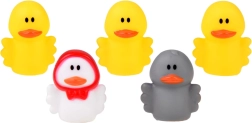 Set sadrži pet patkica: jednu bijelu s crvenim šalom, jednu sivu i tri žute.
