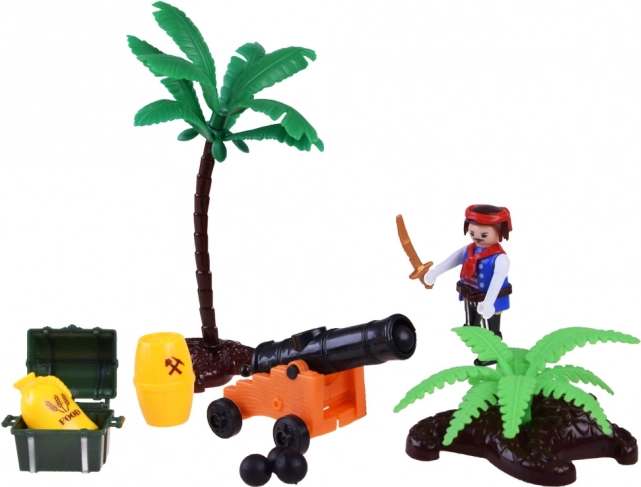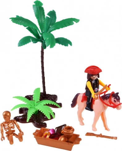 Četiri različite figurice i životinjski pratitelj stvaraju živu posadu. Nadopunite ih čamcem, palmom i bačvama i rađaju se beskrajne piratske priče.
