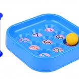 - Plastično postolje, 3 obostrane kartice s igralištima, 2 loptice, pješčani sat