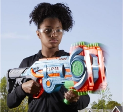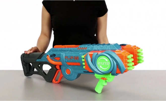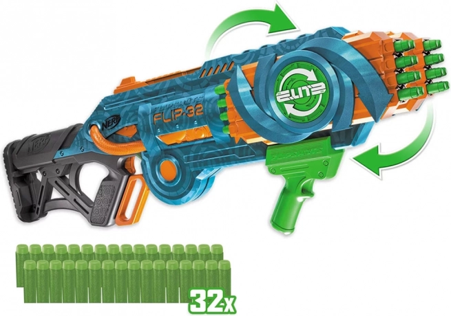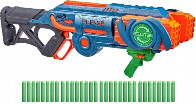Blaster Nerf Elite 2.0 Flip-32 izrađen je od kvalitetne plastike i strelice su od sigurne pjene s gumenim vrhovima. Sustav rotirajućih spremnika omogućava fleksibilnost i nastavak igre i nakon ispaljivanja prve serije strelica. Dovoljno je okrenuti spremnik za 180 stupnjeva i zabava može se nastaviti. Dvije mogućnosti pucanja nude pojedinačno ispaljivanje ili dvostruku strelu.