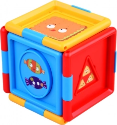 Kocka je ukrašena šarenim sličicama i živim bojama, što dodatno povećava njezinu privlačnost i potiče dječju znatiželju. Izrađena je od plastike, koja osigurava njezinu izdržljivost i sigurnost za male korisnike.
