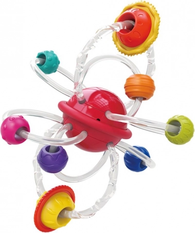 Otkrijte silikonsku grickalicu 2u1 s planetima i obručima koja pruža olakšanje pri nicanju zubića i istovremeno stimulira osjetila. Igračka je opremljena rotirajućim crvenim planetom iz kojeg izlaze fleksibilne silikonske cjevčice s raznobojnim obručima koji imaju različite izbočine, pomažući u masaži nadraženih desni vašeg djeteta.