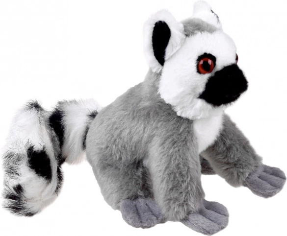 Sjajne plastične oči i crno‑bijeli prugasti rep daju lemuru živ i vjeran izgled.