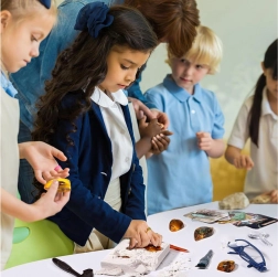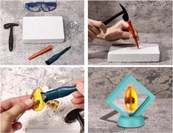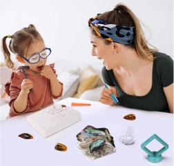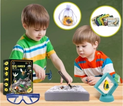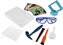 Pretvorite dječju sobu u mali paleontološki laboratorij. U gipsanom odljevku skriveno je 6 „komada jantara“ sa zatopljenim kukcima koje dijete korak po korak otkriva uz pomoć čekića, dlijeta i kista. Sigurnost osiguravaju zaštitne naočale, a za detaljno proučavanje služi povećalo.