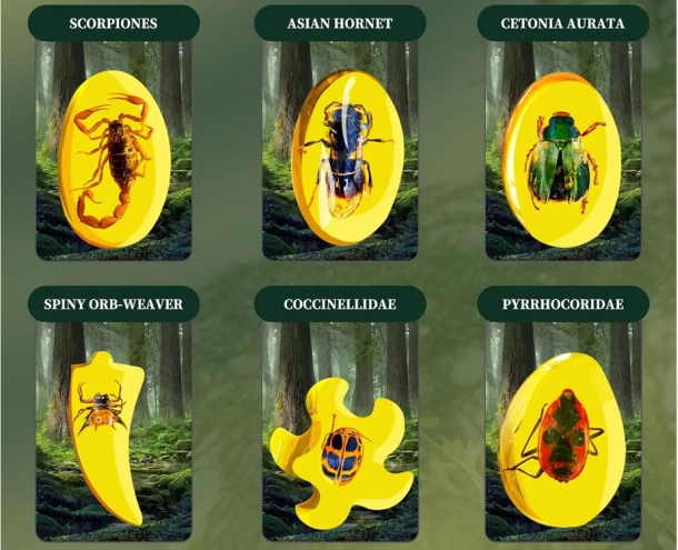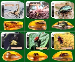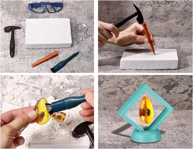 Gipsani blok skriva šest „jantara“ s kukcima. Djeca ih postupno otkrivaju pomoću čekića, dlijeta i kista – sigurno i zabavno.