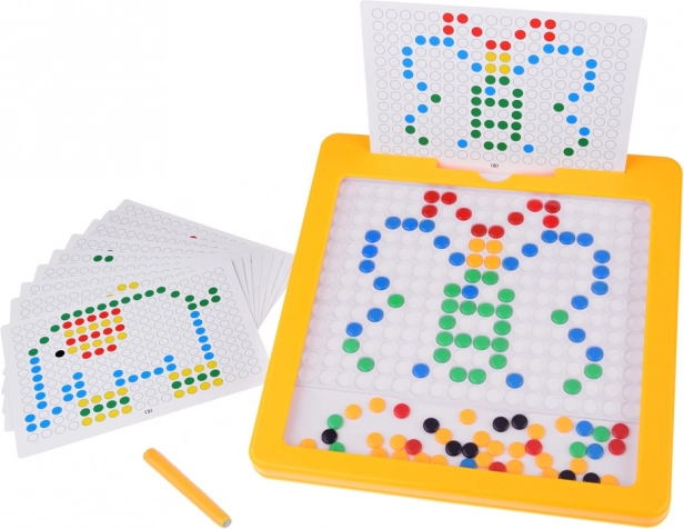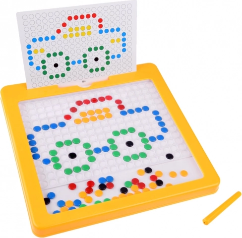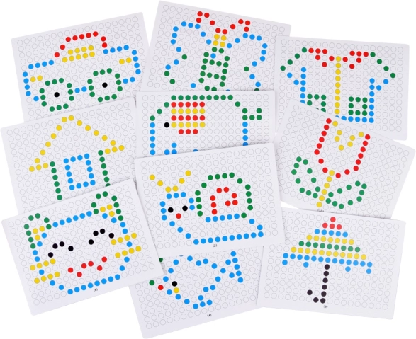 U paketu su kartice s motivima (auto, kuća, riba, cvijet itd.) koje djeca prenose na mrežu pomoću obojenih klinčića. Učenje oblika i uzoraka je zabavno i intuitivno.