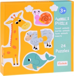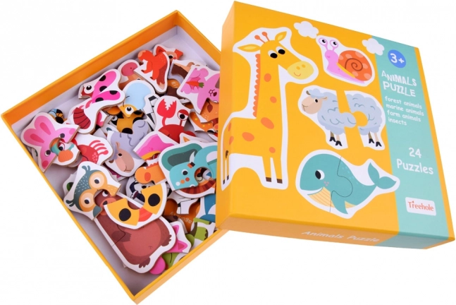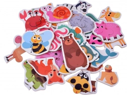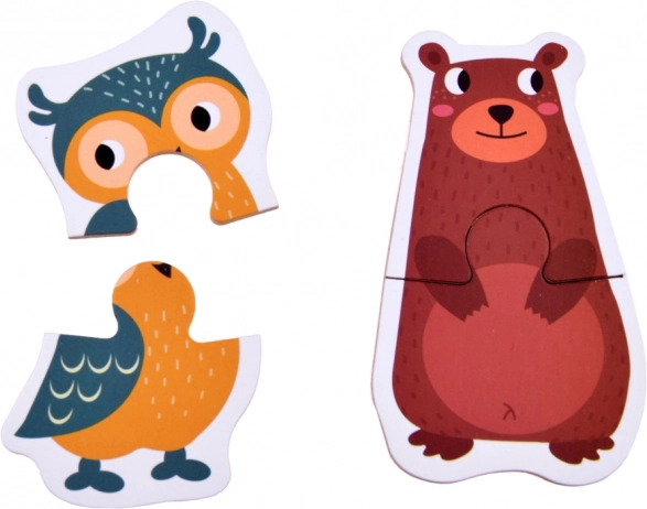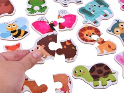 Ovaj raznobojni set sadrži simpatične ilustracije životinja sa safarija, iz šume, dvorišta, livade i vode. Svaki motiv sastoji se od dva veća dijela koji se djeci lako drže i slažu. Zahvaljujući jednostavnom principu, djeca brzo stječu sigurnost i radost uspjeha.