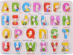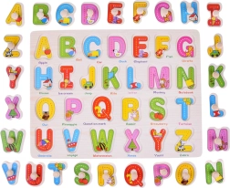 Ova drvena abeceda izvrstan je pomagač pri prvom upoznavanju sa slovima. Veliki, šareni dijelovi s drvenim gumbićima lako se vade i umeću, što prirodno razvija koordinaciju oko–ruka i finu motoriku. Svako slovo ima svoju sličicu i englesku riječ (npr. A – Apple, B – Ball, R – Rabbit), pa se djeca uče slovima i osnovnom rječniku istodobno.
