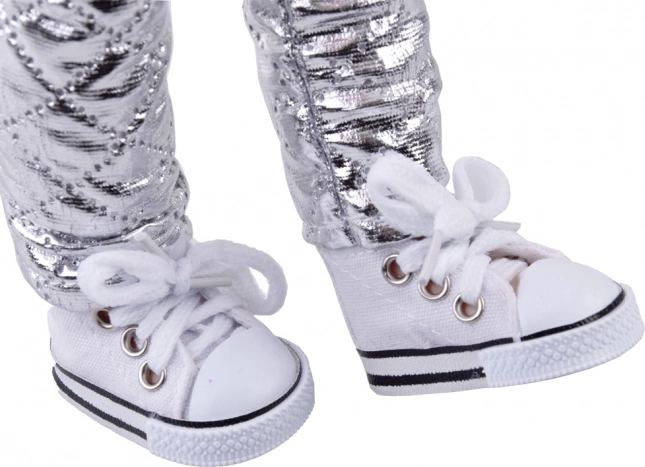 Mekani ružičasti kaput od krzna, klapne za uši i srebrne hlače upotpunjuju bijele tenisice na vezanje – idealno za zimske pustolovine u mašti.