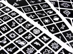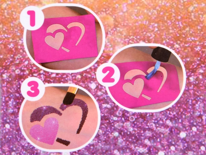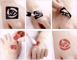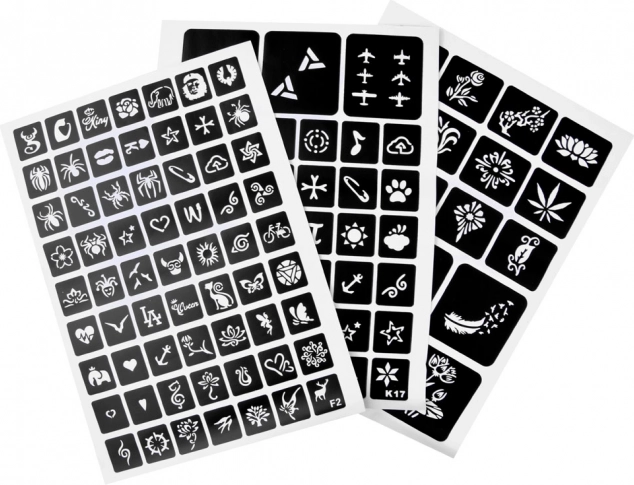 Upute: Odaberite šablonu i zalijepite je na čistu kožu, nanesite ljepilo po uzorku, skinite šablonu, dodajte boje šljokica i gotovo!