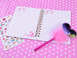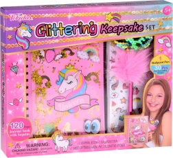Ovaj čarobni dnevnik s motivom jednoroga nudi idealan prostor za zapisivanje vaših misli, tajni i ideja. S sjajnim omotom posutim šljokičavim česticama, dnevnik pruža jedinstven i privlačan izgled. Privlačni set također uključuje ružičastu olovku s pahuljastim pomponom i šljokičavim srcem, zajedno s raznobojnim naljepnicama za kreativno uređenje.