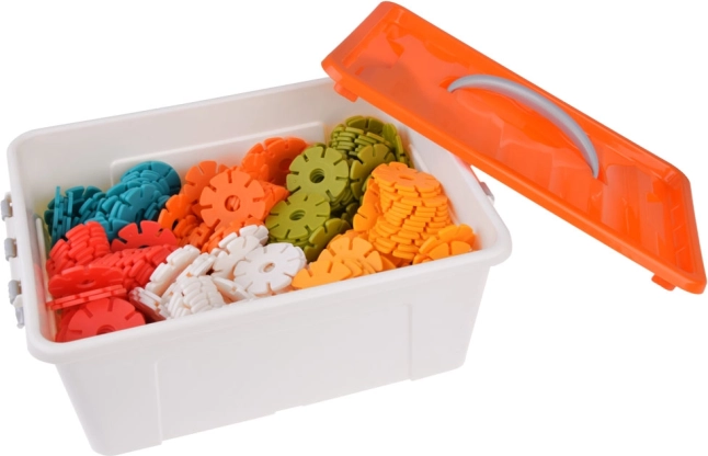 Plastična kutija s poklopcem i ručkom olakšava skladištenje i prijenos konstrukcija.