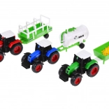 - 3 traktora u crvenoj, plavoj i zelenoj boji, s različitim prikolicama za korištenje u poljoprivrednim aktivnostima