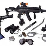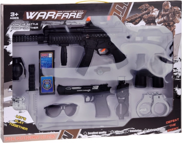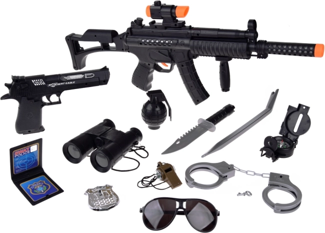 Set pruža kompletnu opremu za realistično igranje policijskog ili vojnog časnika.
