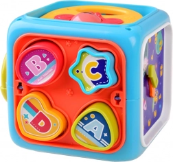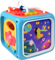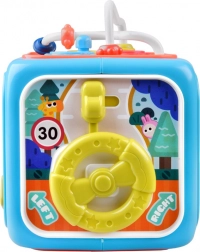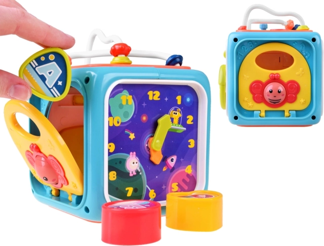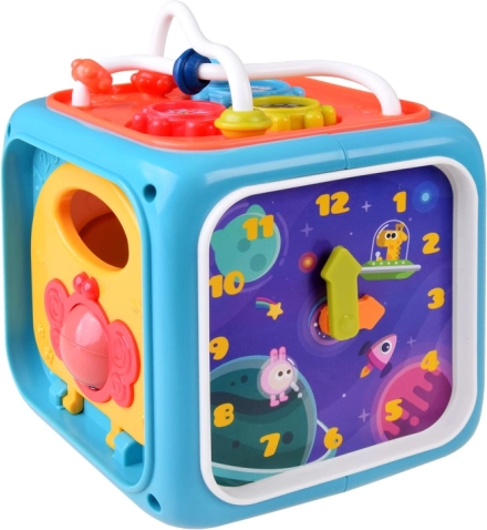 Ova multifunkcionalna aktivna kocka usavršava dječje vještine kroz igru. Djeca vježbaju manipulativne sposobnosti na labirintu s perlama i zupčanicima, uče razvrstavanje oblika uz sorter, a uz sat s pomičnim kazaljkama mogu otkrivati dnevni ritam i prve osnove mjerenja vremena.