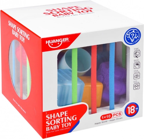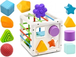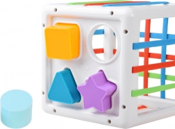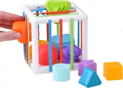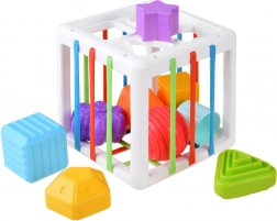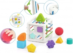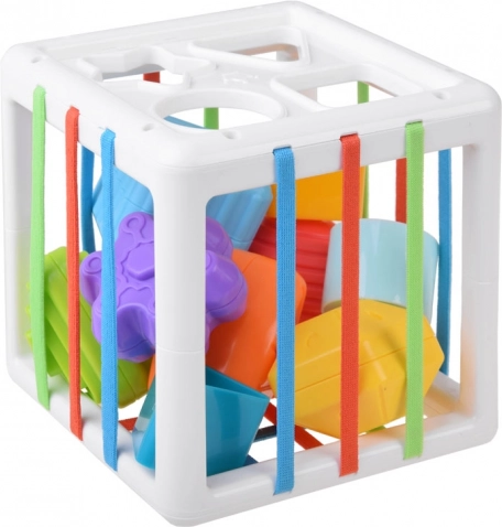 Ova edukativna didaktička kocka nudi djeci mnogo smislenih aktivnosti – ubacivanje i izvlačenje elemenata kroz šarene elastične trake i kroz otvore oblikovane prema formama. Zahvaljujući raznolikoj paleti oblika (trokut, kvadrat, krug, zvijezda, kugla, cvijet, peterokut itd.) djeca vježbaju prepoznavanje oblika i boja te prirodno razvijaju finu motoriku.
