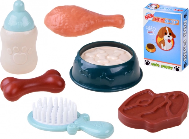 Dio seta su zdjelica s imitacijom hrane, bočica, češalj, kost, pileće zabatno, odrezak, kutijica s hranom i naljepnice – sve za realističnu njegu.