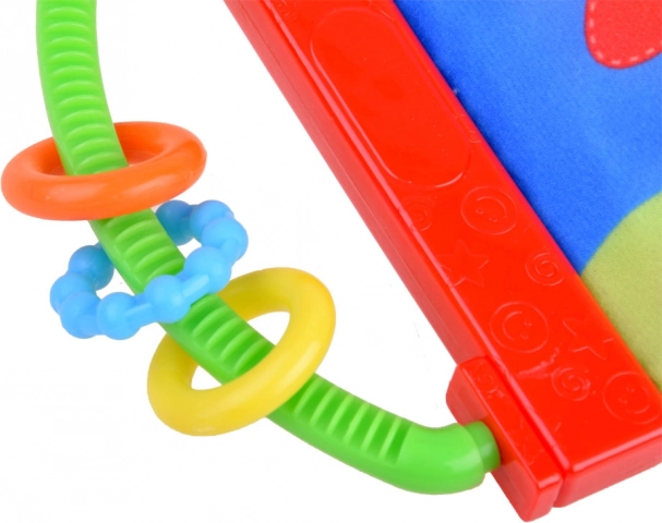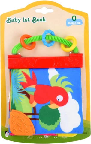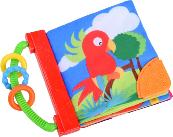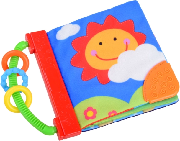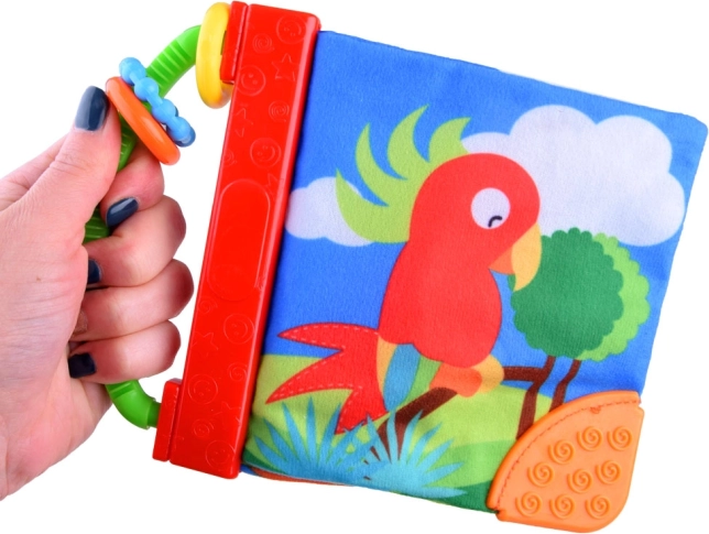 Otkrijte prvu platnenu knjižicu za najmlađe koja potiče senzorni razvoj, učenje boja i oblika te razvoj fine motorike. Mekane tkanine, šuškave stranice, zviždaljke, ogledalce i grickalice zaokupit će bebu na duže vrijeme. Praktična plastična ručka s raznobojnim prstenovima olakšava držanje i pričvršćivanje na kolica ili autosjedalicu.