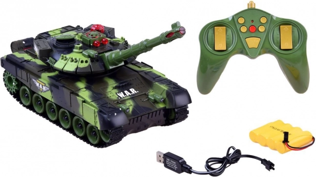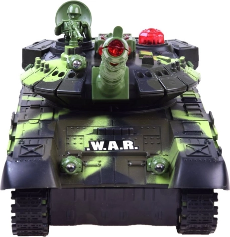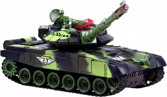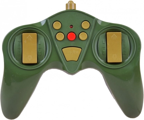 Uživajte u akcijskim dvobojima s RC tenkom u šumskoj kamuflaži. Model savladava vožnju naprijed/natrag, okret na mjestu i ima rotirajuću kupolu od 180° na svaku stranu (ukupno 360° pokrivanja). Pri pogotku se pale/gase lampice statusa bitke, a tenk simulira realističan trzaj koji pojačava doživljaj pravog bojišta.