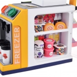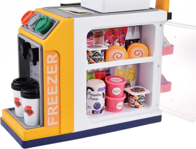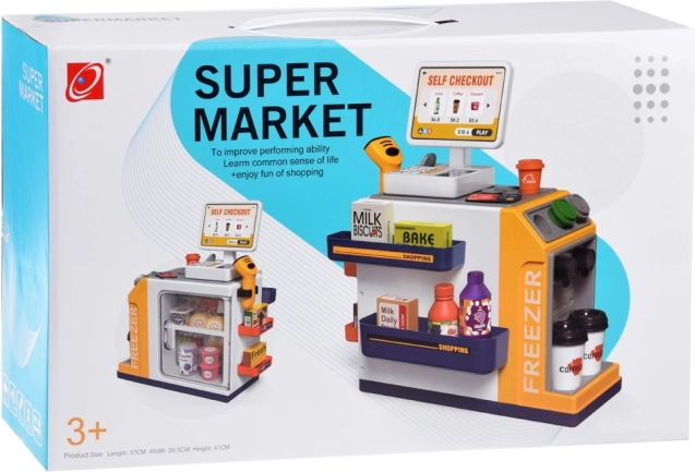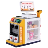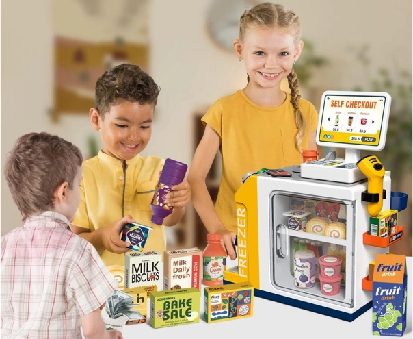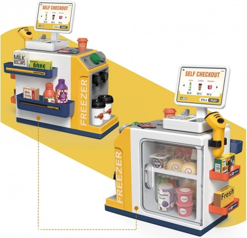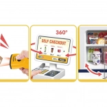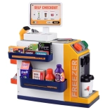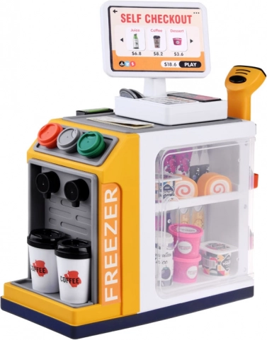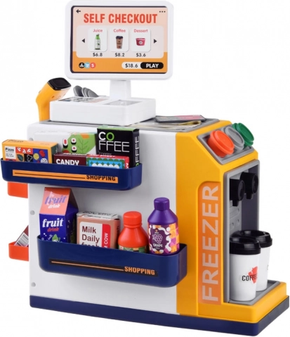Ova realistična samoposlužna blagajna s kutkom za kavu pretvara sobu u mali supermarket. Djeca iskušavaju usluživanje kupaca, pripremu kave, skeniranje robe i plaćanje karticom ili “gotovinom”. Integrirani zamrzivač/hladnjak za deserte i pića, šarene tipke i zaslon stvaraju autentičan doživljaj.