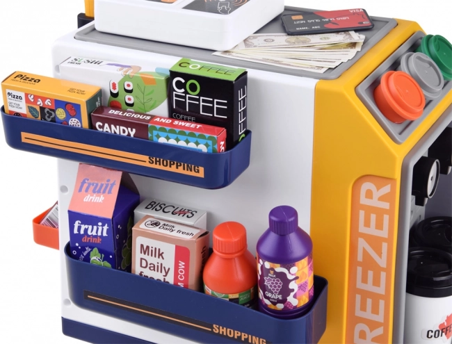 Čaše za kavu i espresso, novčanice, kovanice, kreditna kartica te razna pića i kutijice s robom – sve za kreativnu igru uloga i razvoj mašte.