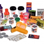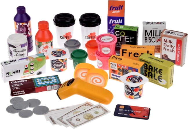 Set sadrži 46 pažljivo dizajniranih elemenata: blagajnu sa zvukom, skener sa svjetlom, čitač kartica, čaše za kavu i espresso, makete pića, jogurte, sladolede i papirnate kutijice (mlijeko, keksi, kava, sushi, pizza itd.), kao i novčanice, kovanice i kreditnu karticu. Time se razvijaju komunikacija, fina motorika i financijska pismenost.