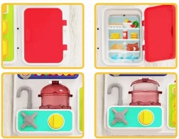 Set uključuje mikrovalnu, štednjak i druge kuhinjske elemente s funkcijama koje simuliraju stvarne zvukove i efekte kuhanja.