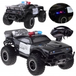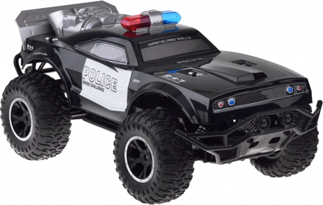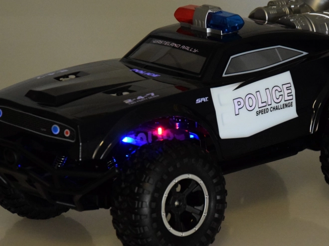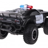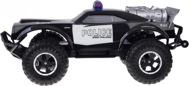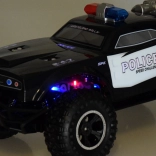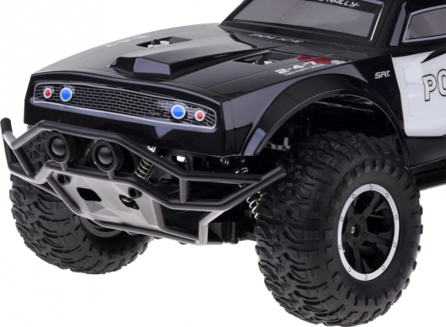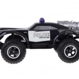 Monster truck se ističe robusnim dizajnom s upečatljivim policijskim detaljima, uključujući crveno-plavo osvjetljenje i natpise POLICE.