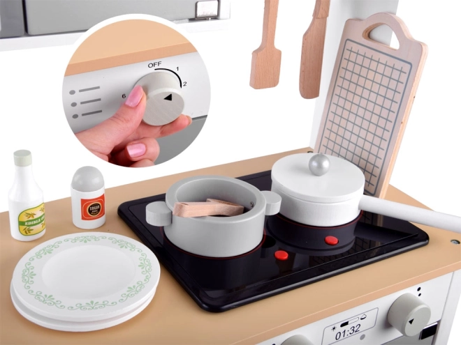 Drvena interaktivna kuhinjica je idealno sredstvo za razvoj kreativnosti i motoričkih vještina vaše djece. Ovaj dječji set oponaša svakodnevne aktivnosti, potiče imaginativnu igru i potpuno je izrađen od prirodnog drva, čime osigurava sigurnost i izdržljivost.