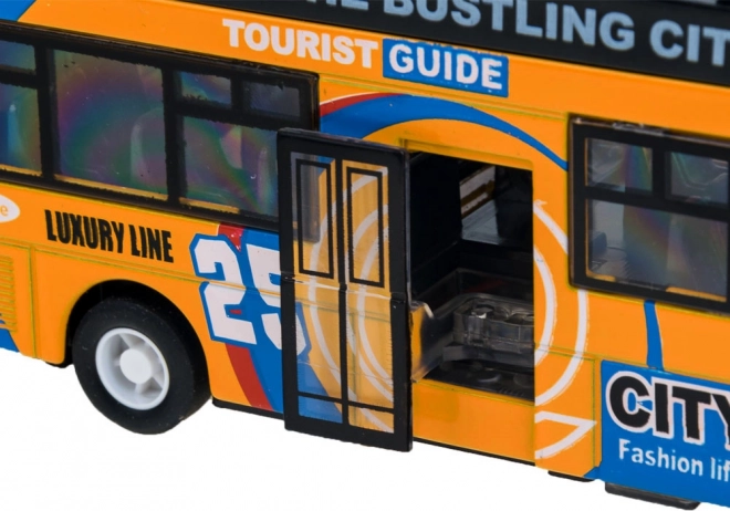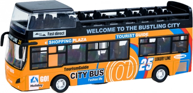 Realistični dvospratni autobus za djecu nudi metalnu karoseriju, klizna vrata koja se otvaraju, svjetlosne efekte i zvukove motora i trube. Zahvaljujući inercijskom mehanizmu (pull-back) juri naprijed nakon povlačenja i potiče kreativnu igru malih putnika i vozača.