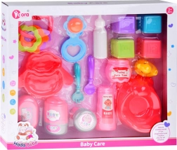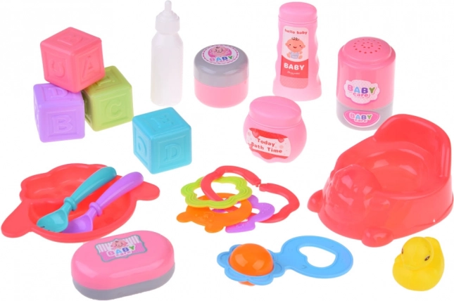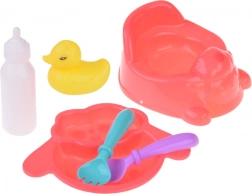 Ovaj set dječjih igračaka nudi sve što mala mamica treba za brigu o svojim lutkama. Sadrži osnovne alate za igranje uloga, poput kahlice, tanjurića sa žlicom i vilicom, te razne bočice i patkicu za kupanje. Svaka od tih rekvizita osmišljena je kako bi poticala dječju maštu i motoriku.