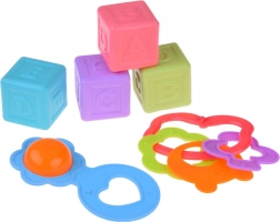 Set sadrži elemente koji pomažu u razvoju fine motorike i koordinaciji oka i ruke, poput šarenih patkica i raznih igračaka za slaganje.