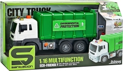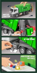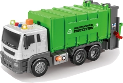 Kamion je detaljno izrađen i opremljen stražnjim pogonom na trenje – dovoljno je pritisnuti kamiončić, pustiti ga i gledati kako brzo se kreće. Otvoriva nadogradnja omogućuje istresanje otpada na predviđeno mjesto. U paketu se nalaze i male plastične kante koje djeca mogu lako priključiti i istresti njihov sadržaj u kontejner kamiona.