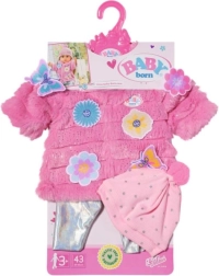 Ugrijte svoju lutku u preslatkom BABY born setu za lutke od 43 cm. Set sadrži mekano ružičasto krzno sa šljokicama, metalno sjajne tajice i kapicu s pomponom. Ukrasne cvjetne i leptir mašne/naljepnice daju outfitu čar i stil, dok kvalitetni materijali osiguravaju ugodno oblačenje i dugotrajnost pri svakodnevnoj igri.