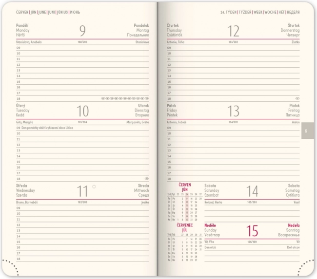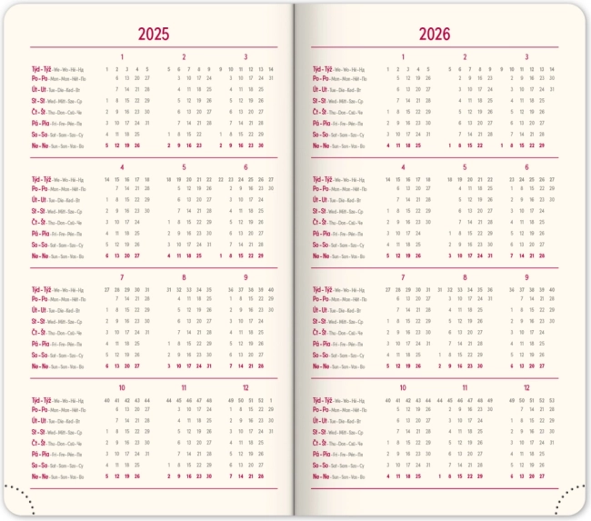 Džepni planer Notique Diamante 2025 ističe se kompaktnom veličinom 9 × 15,5 cm i elegantnim crvenim izvedenjem. Nudi tjedni pregled s češko‑slovačkim kalendarom te dodatno engleski, njemački, mađarski i ruski jezik. Zahvaljujući preglednim planerima i praktičnim detaljima uvijek ćete imati svoje zadatke i sastanke pod kontrolom.