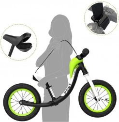 Podesiva visina sjedala (cca 31–38 cm) raste s djetetom, a ergonomski oblikovana upravljačka cijev s protukliznim ručkama pruža dodatnu sigurnost pri upravljanju. Tu je i zaštitna gumena obloga na okviru za veću sigurnost. Roditelji će cijeniti traku za nošenje i pametan pretinac u sjedalu koji prima traku i sitnice.
