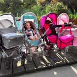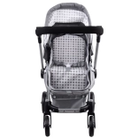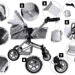 Praktična oprema uključuje sklopivu kapuljaču za zaštitu lutke, podesive sigurnosne pojaseve, mekanu i po visini podesivu ručku, prostranu košaru za sitnice i modernu torbu za pribor. Okretni prednji kotači i puna EVA kotača omogućuju udobno upravljanje u domu i na otvorenom.