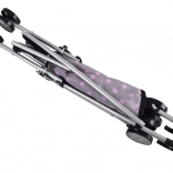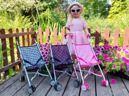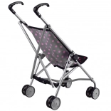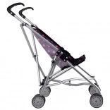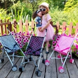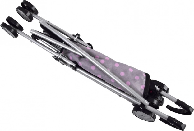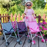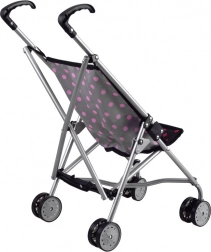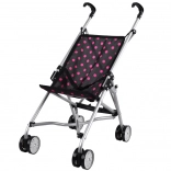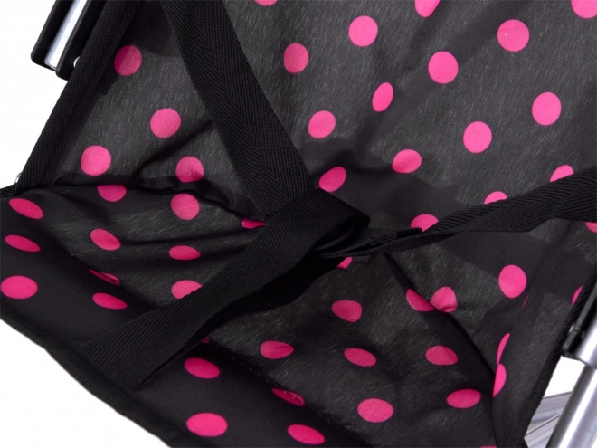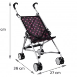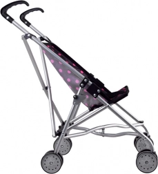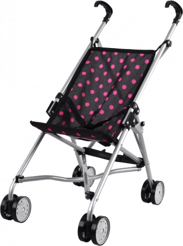 Tekstilno sjedalo u modernom dizajnu u crnoj boji s ružičastim točkicama izdržljivo je i ugodno na dodir. Dvostruki kotačići jamče glatku vožnju i dobru upravljivost na raznim podlogama. Sigurni sklopivi/rasklopivi elementi i remenčići u sjedalu pomažu zadržati lutku na mjestu.
